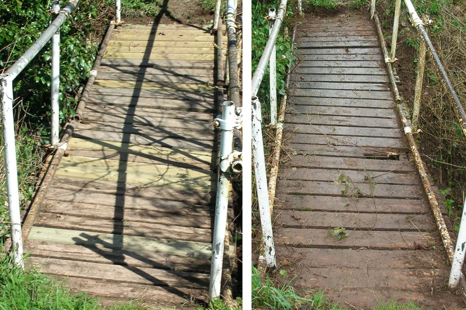 The bridge is formed basically of three scaffolding poles laid across the ditch, then the decking sections placed on top with the ends of the planks resting on the outer poles. Scaffolding poles are then fixed over the top of the planks to prevent them moving.